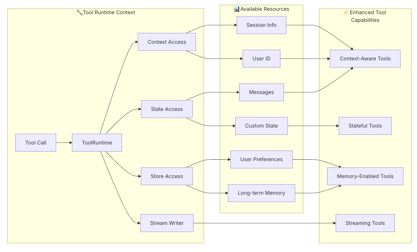 工具只是简单的一来一去的调研的确很简单,但复杂的Agent中工具的使用需要与上下文进行深入的交互。当工具能够访问agent状态、运行时上下文和长期记忆时,工具就能够做出具有上下文感知的决策、个性化响应,并在对话中保持信息的连贯性。Runtime context运行时上下文提供了一种在运行时将依赖项(如数据库连接、用户ID或配置)注入工具的方法,这使得工具更易于测试和重用。